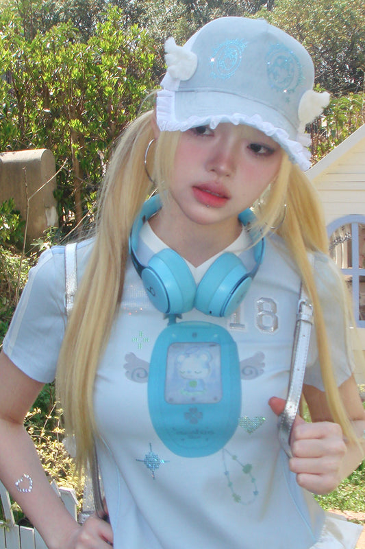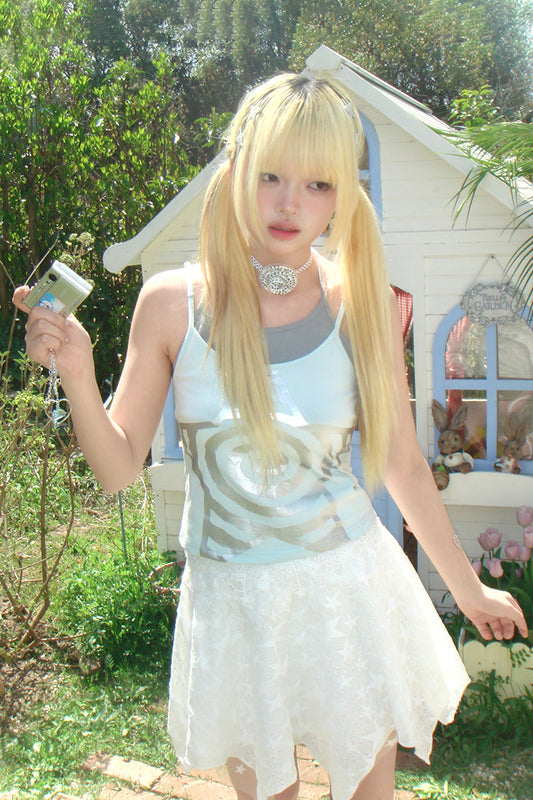 Girl Illustration fake two piece Neck Hanging Strap T-shirt